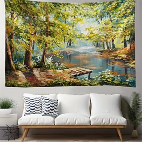 impresjonistisk natur landskap sollys skog grønne trær innsjø brygge oljemaleri stil veggteppe til stue soverom sovesal rolig skogdekor