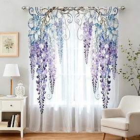 Fire årstiders gjennomsiktig vindusgardin til soverom/stue, blåregn og slyngplantedesign, elegant blomstermønster med stanglomme, myk og lett dekor til hjemmet