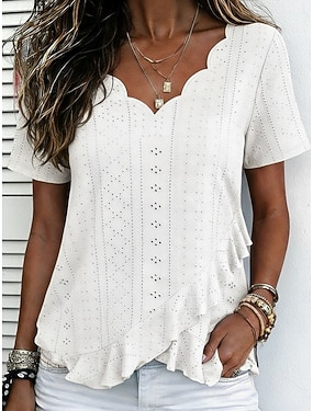 Dame Pointelle-skjorte Øyetopp Bluse Rynket Uthult عادي Aktiv Stilfull Kortermet V-hals Vanlige topper Avslappet Daglig Strand Blå Hvit Gul Rosa Sommer Vår