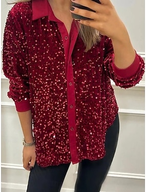 Dame Skjorte Bluse Topper med paljetter Paljetter Lapper Knapper Fargeblokk Årgang Stilfull Langermet Aftæpning Vanlige topper Gateklær Fest Festantrekk Sølv Svart Rød Lilla Gull Vår Høst