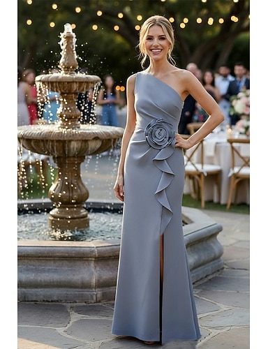 Linjeform Gulvlengde Gjestekjole til bryllup Formell kjole Aftenkjole Kjole til brudens mor Ermeløs 3/4 ermer Enskuldret Elegant Enkel Formell Stretch Crepe med 3D-blomster Drapert