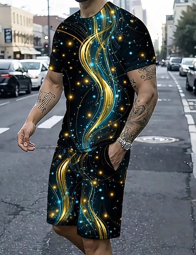 Herre Geometrisk Linje 2stk T-skjorter sett Sommertopper Kortermet Korte bukser Crew-hals Fritid trendy Daglig Feriereise 3D-utskrift Sommer Blå Lilla Grønn
