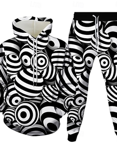 Herre Horisontale strips 2stk 3D-genseresett Joggedress Hettegenser Langermet Lange bukser Med hette Sportslig Fritid hverdag treningsklær 3D-utskrift Vår Høst Vinter Svart Hvit