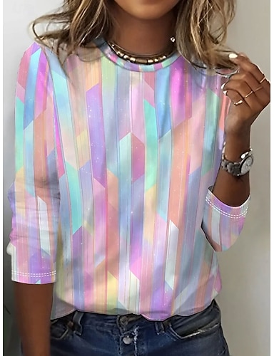 Dame T skjorte Trykt mønster Grafisk Geometrisk Stripet Årgang Stilfull Klassisk Kortermet Crew-hals Vanlige topper Avslappet Daglig Blå Lysegrønn Rosa Lysebrun Svart Sommer Vår