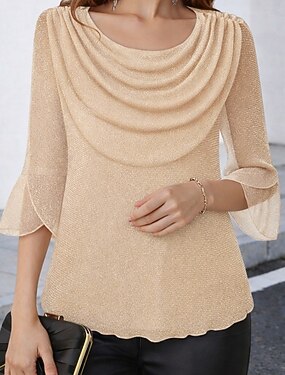 Dame T skjorte Mesh Patchwork Topp Glitrende topper Netting Elegant Stilfull 3/4 ermer Klokke Ermer Cowl-hals Vanlige topper Helg Festantrekk Date Night antrekk Blå Svart Rød Lilla Lys Gull Vår Høst