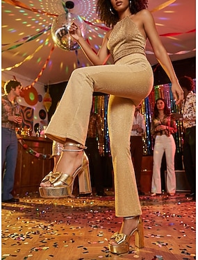 damesko med diskotek i gull fra 1970-tallet – glitrende glitter, kraftige høyhælte sandaler med sløyfedetaljer for fester og nattklubbarrangementer i Studio 54 &glamorøse retro-antrekk