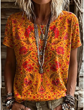 Dame T skjorte Trykt mønster Grafisk Planter Årgang Stilfull Klassisk Kortermet Crew-hals Vanlige topper Daglig Helg Rød Oransje Beige Sommer Vår