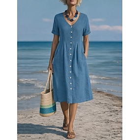 Dame Midikjole Imitert bomullslin Kjole med A-linje Fritid Daglig Normal عادي Kortermet V-hals Blå Svart Hvit Vin Sommer Vår