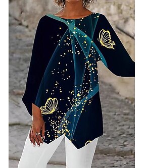 Dame Bluse Trykt mønster Asymetrisk kant Sommerfugl Daglig Stilfull Langermet Crew-hals Vanlige topper Daglig Ferie Navyblå Sommer Vår