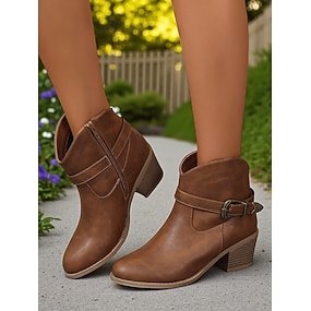 Brune westernstøvletter med blokkhæl i kunstskinn til dame – glidelås og spenne på siden, til hverdagsbruk og konsertsko i landlig stil