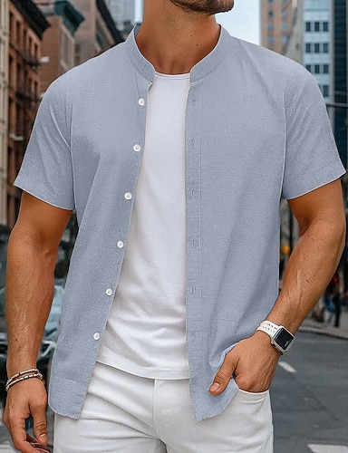 Herre Skjorte Linskjorte Sommerskjorte Strand Klær Skjorte med bandkrage Skjorte med knapper Helfarge Avslappet Feriereise Blå Svart Hvit Rosa Kortermet Kinesisk Krave Sommer Vår Klær Lomme