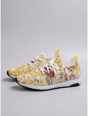 gule blomsterprint strikkede sneakers til dame – lette, pustende fritidssko med polstret, sklisikker såle, moteriktige tursko for reiser, utendørs og hverdagsbruk