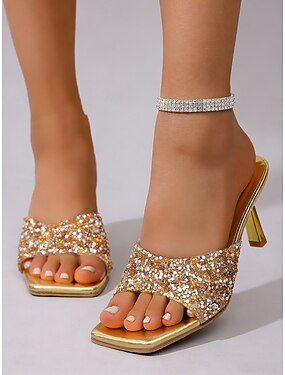 Gullfargede paljettformede slip-on-hælsko til dame – elegante feriesko til kvelden, perfekt for feriemiddager og strandarrangementer