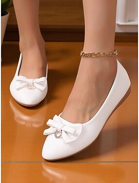 Røde damesko i kunstskinn med sløyfe og strassdetaljer – søte ballerinasko med rund tå og perlemorfarget ankelstropp for fritidsbruk, hverdag og kontor