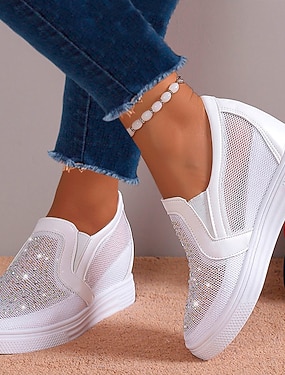 Dame Treningssko Slip-Ons Kilehæl Hevende Sko Plattform joggesko Daglig Helfarge Galakse Selvlysende Rhinsten Kile Hæl Skjult Hæl Rund Tå Mote Sportslig Fritid Gange Netting Tøfler Svart Hvit