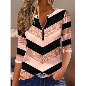 Dame T skjorte Glidelås Trykt mønster Grafisk Geometrisk Stripet Elegant Årgang Stilfull Langermet Rund hals Hals med hakk Vanlige topper Daglig Helg Rosa Vår Høst Vinter
