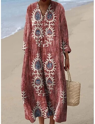 Kvinne Maxi Kjole Boho Sommerkjole Shift Kjole Ferie Casual Strand Ute Vanlig Passform Grafisk Paisley Stamme Langermet V-hals Blodrød Oransje Sommer Vår