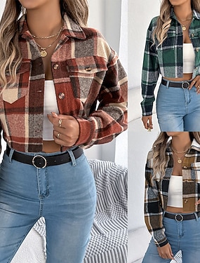 Dame Uformell jakke Shacket Bekvem Pustende Lomme Knapper Trykt mønster Fritid Ruter Feriereise Gate Avslappet Dagligdagstøy Enkeltkneppet Kort Aftæpning Normal Langermet Yttertøy Oransje Grønn