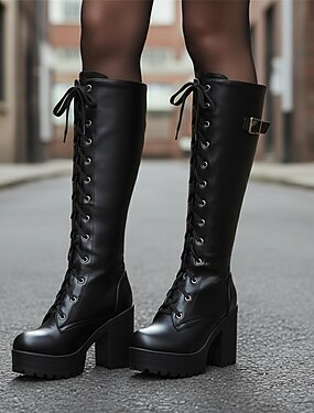 svarte plattformstøvler med snøring og knehøye med tykke hæler og spenndetalj – gotisk eller punk-stil for høst og vinter