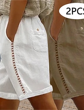 flerpakninger 2 stk. dameshorts i 100 % bomull sommershorts strandshorts feriemote basiskort naturlig ensfarget sidelommer utskjæring komfort pustende uelastisk gate casual hvit+khaki