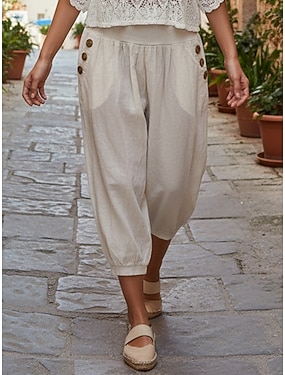 Dame Capri-bukser Imitert bomullslin Sommershorts Harem-bukser Grunnleggende Fritid Bohem Kalv lengde Middels midje عادي Lomme Elastisk midje Komfort Uelastisk Daglig utendørs Feriereise Rishvit