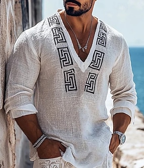 Herre Skjorte Linskjorte Popover skjorte Sommerskjorte Strand Klær Etnisk skjorte Geometrisk Feriereise Ferie Hvit Langermet V-hals Sommer Vår Klær