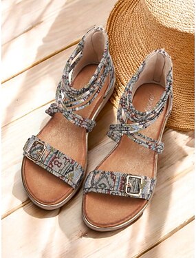 flate sandaler med stropper for kvinner – gladiatorsandaler med etnisk trykt ankelomslag med spenne for sommer-, strand- og uformelle antrekk