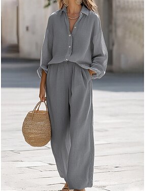 Dame Skjorte Lin-inspirerte sett Todelt sett Bukser med brede ben Linbukser Bukser Langermet Skjortekrage Helfarge Mote Gatemote Dagligdagstøy Stevnemøte Gul Navyblå Grå Vår Normal