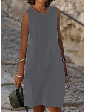 Dame Mini kjole Skiftkjole Kjoler i bomullslin Kjole i lin Uformell kjole Grunnleggende Fritid Daglig Feriereise Normal عادي Kortermet Crew-hals Blå Svart Kakifarget Grå Sommer