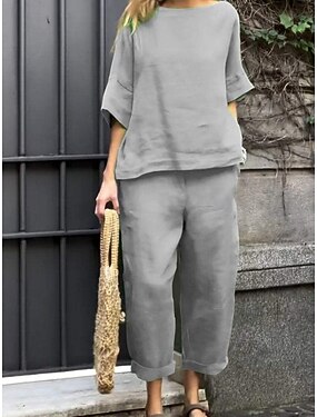 Dame Buksesett Imitert bomullslin 3/4 ermer Rund hals Helfarge Elegant Mote Gatemote Avslappet Daglig utendørs Svart Hvit Gul Sommer Løstsittende