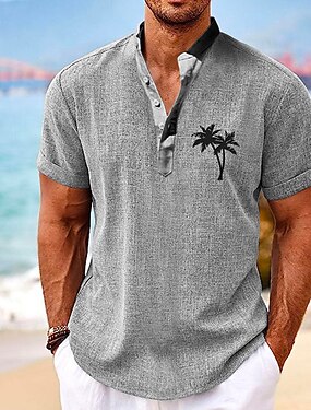 Herre Skjorte linskjorte Strandskjorte Kokosnøttre utendørs Feriereise Svart Grønn Kakifarget Grå Kortermet Høy krage Sommer Vår Klær Trykt mønster