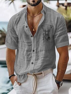 Herre Linskjorte Uformell skjorte Skjorte i bomullslin Skjorte med knapper Dyremønstret Feriereise Dagligdagstøy Svart Hvit Lysegrønn Rosa Kortermet Knaphul Alle årstider Klær Spenne
