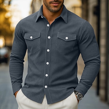 Herre Kordfløyel skjorte Kakifarget Militærgrønn Beige Grå Langermet عادي Krage Aftæpning Avslappet utendørs Lomme Klær Årgang Klassisk Fritid Arbeidstøy