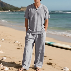 Herre Linskjorte 2 deler Popover skjorte Og Linbukser Bukser Uformelle bukser Sett عادي Daglig utendørs Strand Aftæpning Kortermet Sommer Vår Mote Fritid Bekvem Klær