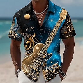 Herre Gitar Musikkinstrument Musikknotater Skjorte Skjorte med knapper Kortermet Vintage retro Daglig musikk festival Sommer Vår Aftæpning 3D-utskrift krage skjorter Blå Lilla Brun