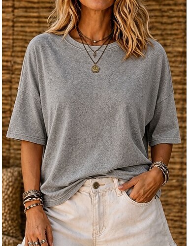 dame-T-skjorte i 100 % bomull vintage-vasket topper mote stilig klassisk korte ermer rund hals lange topper avslappet daglig strand roserød blå gressgrønn svart oransje sommer vår