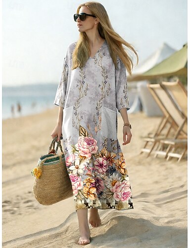 Dame Knelang kjole Uformell kjole Kjole med A-linje Floral kjole Elegant Mote Moderne utendørs Feriereise Ut på byen Normal Blomstret Kortermet V-hals Rosa Grønn Kakifarget Grå Sommer Vår