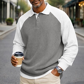 Herre Vaffel poloskjorter Avslappet Knaphul Langermet Mote Moderne Helfarge Fargeblokk Strikket Høst Vår & Vinter Alle årstider Normal Blå Svart Navyblå Lilla Grå Vaffel poloskjorter