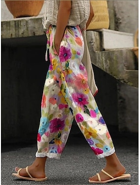Dame Lin Lignende Bukser Baggy Bukser Casual Daglig Lang Blomster Drawstring Side Lommer Utskrift Pusteevne Komfortabel Uelastisk Helg Oransje Grønn Vår Sommer Regulær Passform
