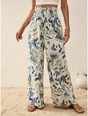 Dame Bred Bukseben Bukser Fritid hverdag Lang Blomstret Bred Bukseben Printer Pusteevne Bekvem Mikroelastisk Feriereise Helg Blå Rosa Navyblå Aprikos Vår sommer Normal