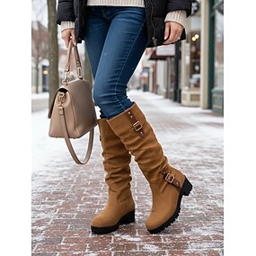 Brune, løse knehøye støvletter i semsket skinn til dame – tykke blokkhæler med glidelåsdetalj, stilige og komfortable for daglig, vinter- og hverdagsbruk