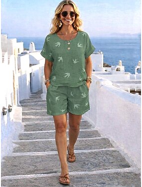 Dame Skjorte Lin-inspirerte sett Todelt sett Strandshorts Løstsittende shorts Kortermet Skjortekrage Helfarge Snorer Ferie Mote Dagligdagstøy Stevnemøte Rosa Grønn Grå Sommer Normal