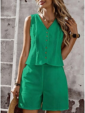 Dame Linsett i bomull Shortssett Ermeløs V-hals عادي Mote Gatemote Avslappet Daglig utendørs Hvit Oransje Grønn Sommer Løstsittende