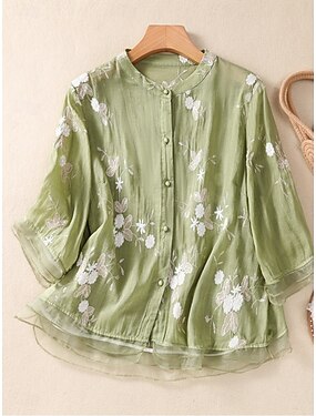 Dame Skjorte Knapp opp Bluse Imitert bomullslin Broderi Knapper Blomstret Grunnleggende Fritid 3/4 ermer Høyhalset Vanlige topper Daglig Gul Lilla Grønn Beige Sommer Vår Høst