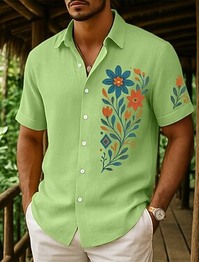 Herre Skjorte Linskjorte Sommerskjorte Strand Klær Skjorte med knapper Blomster Feriereise Curise Rosa Navyblå Grønn Kakifarget Kortermet Krage Sommer Vår sommer Klær
