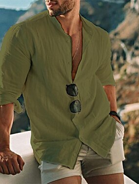 Herre Skjorte Linskjorte Skjorte med bandkrage Sommerskjorte Strand Klær Skjorte med knapper Helfarge utendørs Feriereise Svart Hvit Gul Lysegrønn Langermet Krage Vår Høst Klær