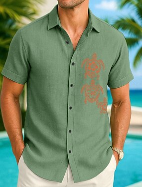 Herre Etnisk Linskjorte Hawaii skjorte Skjorte med knapper Kortermet Hawaiisk Feriested Feriereise Ferie Strand Klær Sommer Vår Aftæpning 3D-utskrift krage skjorter Blå Grønn Kakifarget
