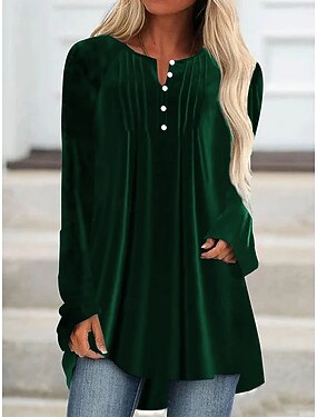 Dame Bluse Helfarge Elegant Stilfull Grunnleggende Langermet Crew-hals Lange topper Daglig Rynket Knapper Vin Blå Grønn Vår Høst