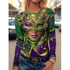 Karneval Mardi gras Dame T skjorte Trykt mønster Grafisk Årgang Mote Stilfull Kortermet Crew-hals Vanlige topper Daglig Lysegrønn Lilla Grønn Sommer Vår