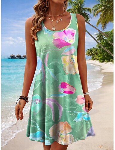 Dame Mini kjole Solkjole Kjole med A-linje Sommerkjole Ferie Fritid Bohem Strand Fest Bryllup Normal Grafisk Tropisk Ermeløs U-hals Blå Lilla Grønn Grå Sommer Vår